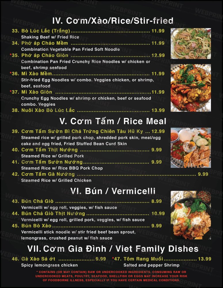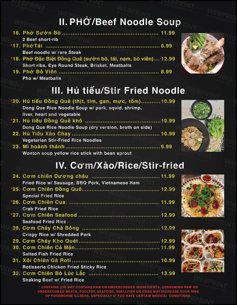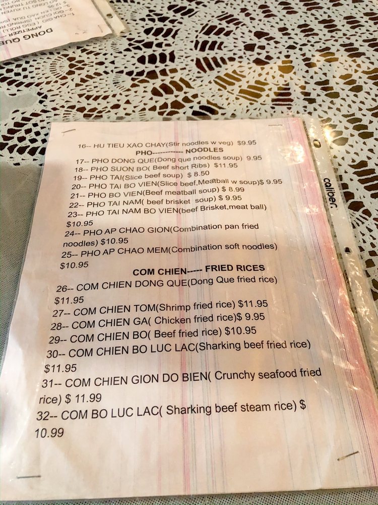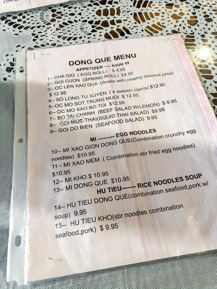 Dong Que, a Vietnamese soup restaurant located in Peoria, AZ, offers a delectable menu showcasing authentic flavors. From the crispy fried squid head to the flavorful beef noodles soup, Dong Que's menu caters to all tastes. The Banh Xeo, a Vietnamese panfried crepe, stands out with its mix of shrimp, pork, and bean sprouts. The Egg noodles soup with minced pork, squid, and shrimp provides a comforting and satisfying meal. Customers rave about the service, quality, and variety of dishes, making Dong Que a must-visit for Vietnamese cuisine enthusiasts. The restaurant's ambiance is clean and inviting, creating a pleasant dining experience. With reasonable prices and generous portion sizes, Dong Que truly impresses with its dedication to authentic Vietnamese flavors.